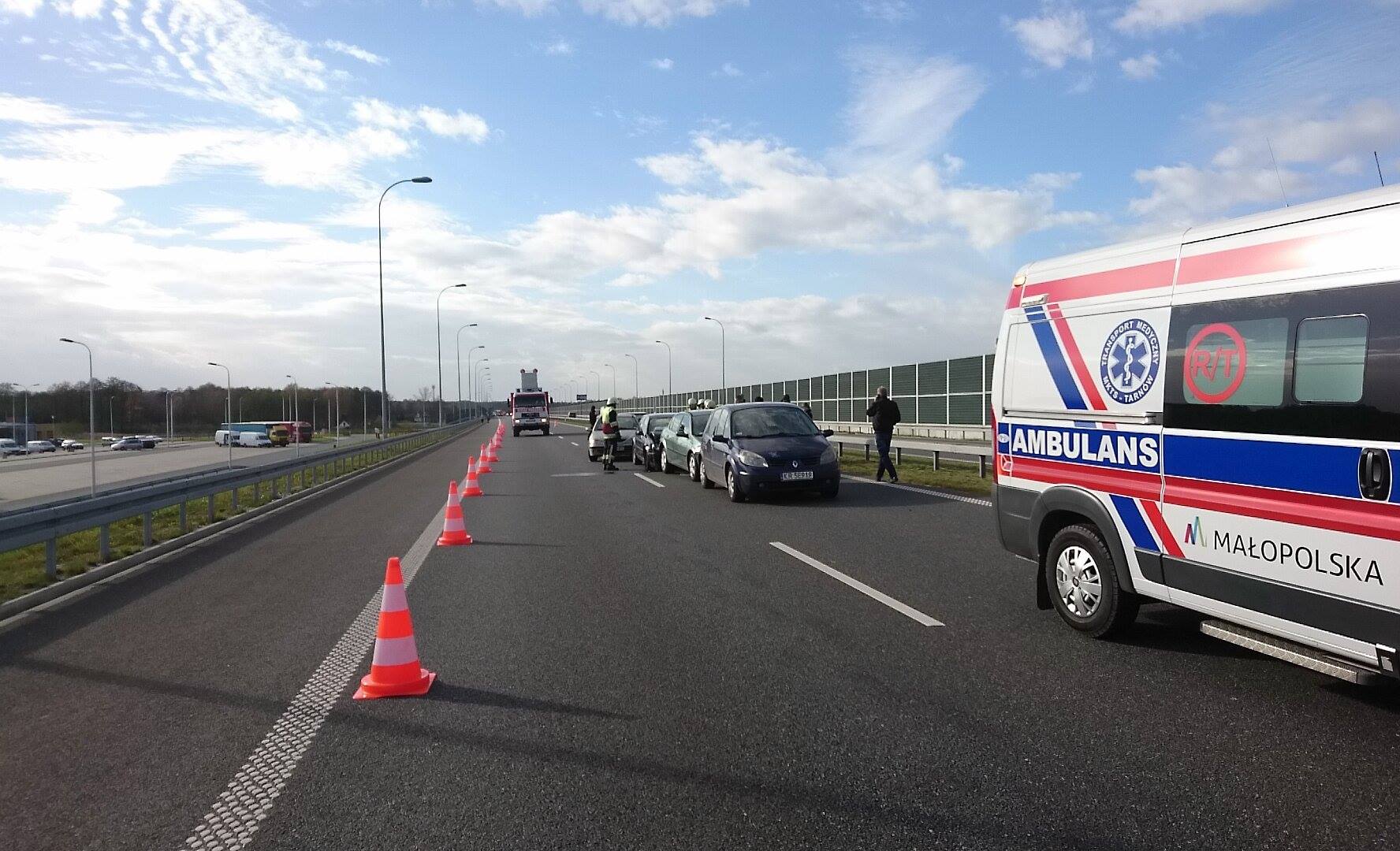 Na wjeździe na MOP Bagno doszło do zderzenia dwóch samochodów, a kilkaset metrów dalej doszło do karambolu z udziałem 5 samochodów osobowych. Na miejscu działają 2 zastępy PSP Brzesko, 1 zastęp OSP Szczepanów, Policja oraz 2 zespoły Ratownictwa Medycznego. Jedna osoba poszkodowana w zdarzeniu została zabrana do szpitala w Brzesku.