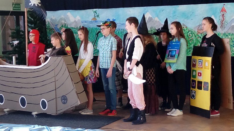 W szkole w Przyborowie odbyło się długo oczekiwane przedstawienie pt. „Wiedźma Multimedia” przygotowane przez uczniów należących do koła czytelniczego. Spektakl miał na celu zwrócenie uwagi uczniów na problem zanikającego czytelnictwa oraz wszechobecnej i ciągle rozwijającej się techniki multimedialnej. Adresatami przedstawienia byli uczniowie szkoły podstawowej szczególnie klasy pierwszej, którzy byli pasowania na czytelnika biblioteki szkolnej oraz dzieci z przedszkola. W tym dniu naszą szkołę nawiedziły postacie z ulubionych bajek : Piraci, kapitan Sztorm, Baba Jaga z kotem i sową, oraz Jaś i Małgosia. Bohaterowie poczytnych bajek musieli stoczyć walkę z Wiedźmą Multimedią oraz z wirusami. Jak to w bajkach bywa wszystko skończyło się happy endem. Prace nad przedstawieniem trwały dwa miesiące, uczniowie wspólnie z rodzicami wykonali potrzebne rekwizyty, stroje oraz oprawę plastyczną. Aktorzy wspaniale prezentowali się w swoich kostiumach, a ich gra przyciągnęła uwagę widzów, którzy z dużym zainteresowaniem oglądali spektakl. Na twarzach maluchów i starszych widać było uśmiech i zadowolenie. Całe spotkanie zakończyło się gromkimi brawami co było dla nas najpiękniejszą nagrodą za trud, jaki włożyliśmy w przygotowanie sztuki.