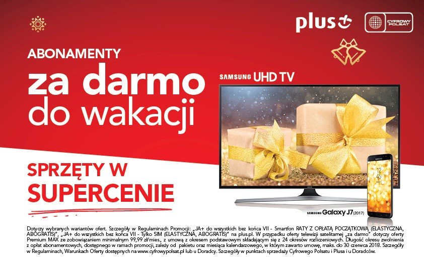 Wracają wakacje od opłat, a w promocji na święta będą one trwały aż do… wakacji! Teraz wybierając ofertę JA+ Abonament można nawet do końca czerwca przyszłego roku nie płacić za abonament. Nowa promocja, to:
