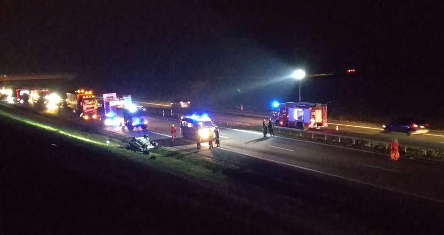 Wg informacji kierowców w zdarzeniu brał udział samochód osobowy, który dachował. Pas w kierunku Krakowa na którym miał miejsce wypadek jest całkowicie zablokowany. Na miejscu zdarzenia działania prowadzą dwa zastępy z JRG Brzesko, OSP KSRG Szczepanów, OSP KSRG Jadowniki, ZRM, Policja oraz zarządca autostrady. Siła uderzenie rozrzuciła części samochodów na drugi pas. Samochody strażackie znajdują się na obu pasach jezdni.